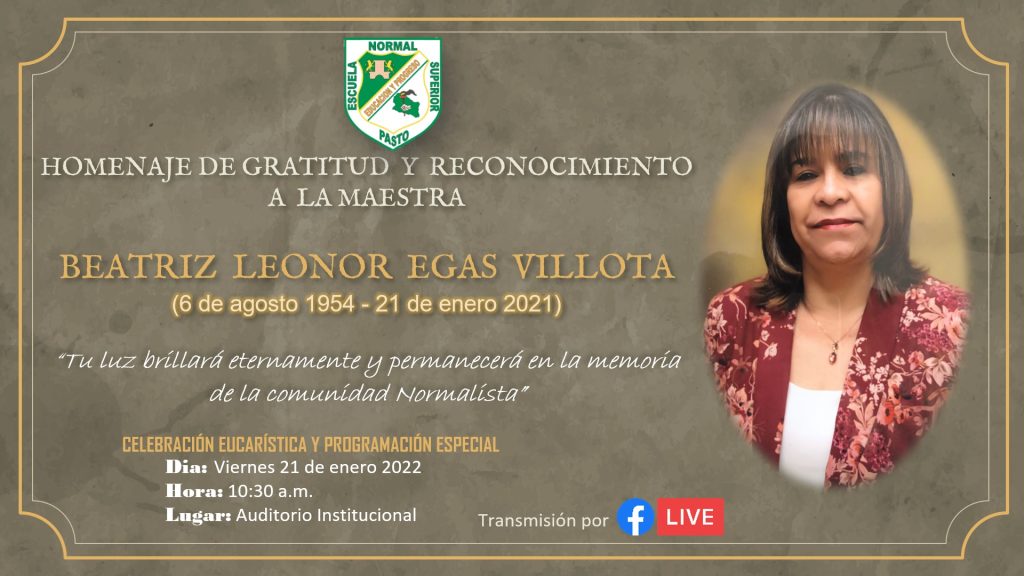 Con el dolor aún surcando nuestros corazones y evocando infinitos recuerdos, el día 21 de Enero del año 2.022 la familia Normalista rinde un homenaje póstumo en memoria de la magíster: LEONOR EGAS VILLOTA, una Maestra de Maestros, Líder Sindical, Directiva docente, Promotora de Derechos humanos, con gran sensibilidad Social, literaria y sobre todo, familiar, […]