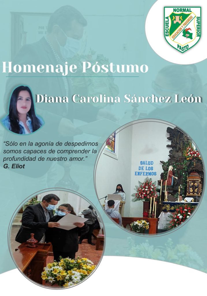 Por: Constanza Estrella Docente. Escuela Normal Superior de Pasto El pasado 11 de febrero de 2022, en la capilla de Lourdes, la Comunidad Normalista rindió un homenaje póstumo a la señorita DIANA CAROLINA SANCHEZ LEÓN estudiante del grupo 13-3, semestre B-2021 del Programa de Formación Complementaria. Fue un momento emotivo donde se destacó sus […]