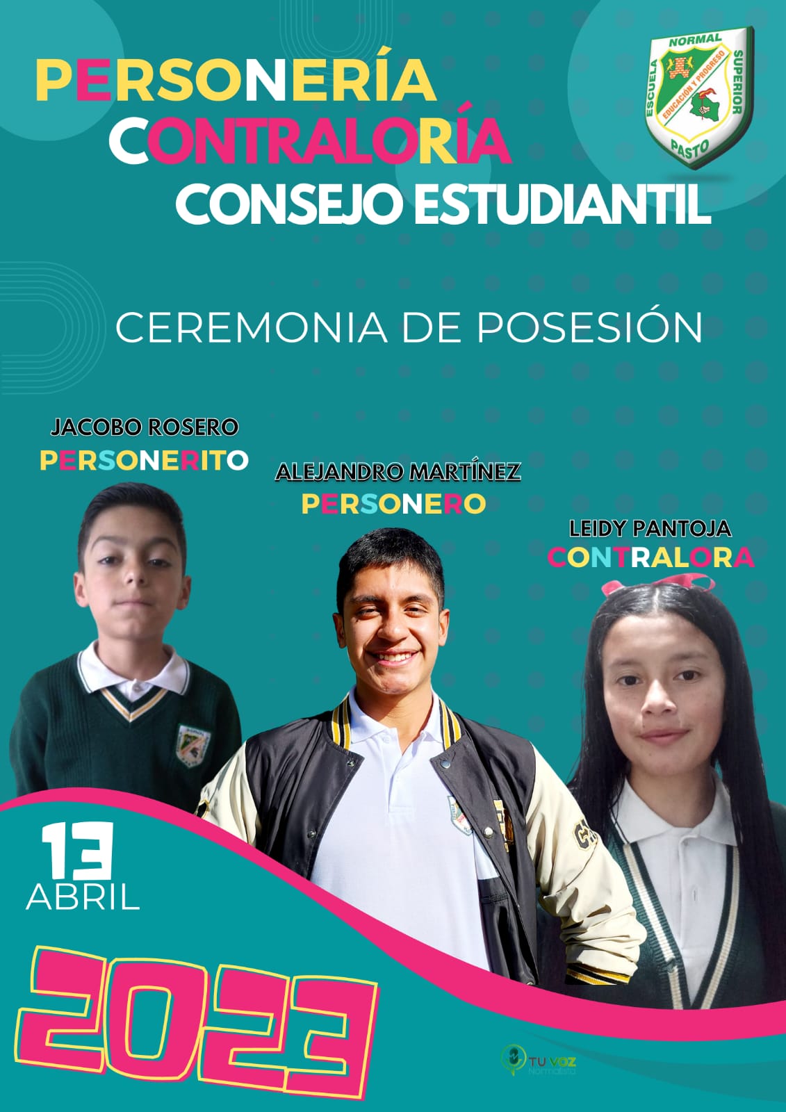 Desde este momento, el Personero, Personerito, Contralora y Consejo Estudiantil, asumen el fiel compromiso de aunar esfuerzos para trabajar por el bienestar y el mejoramiento continuo de la Escuela Normal Superior de Pasto. Auguramos éxitos en el nuevo rol que asumen y reiteramos como integrantes del Proyecto de Democracia y Valores con enfoque en Derechos humanos y construcción de paz, nuestro compromiso de brindar el acompañamiento y el apoyo que requieran para llevar a feliz término las propuestas por las cuales fueron elegidos; y así seguir cumpliendo el lema institucional “por mi patria, mi dama y mi fe”. ¡Orgullosamente Normalista!