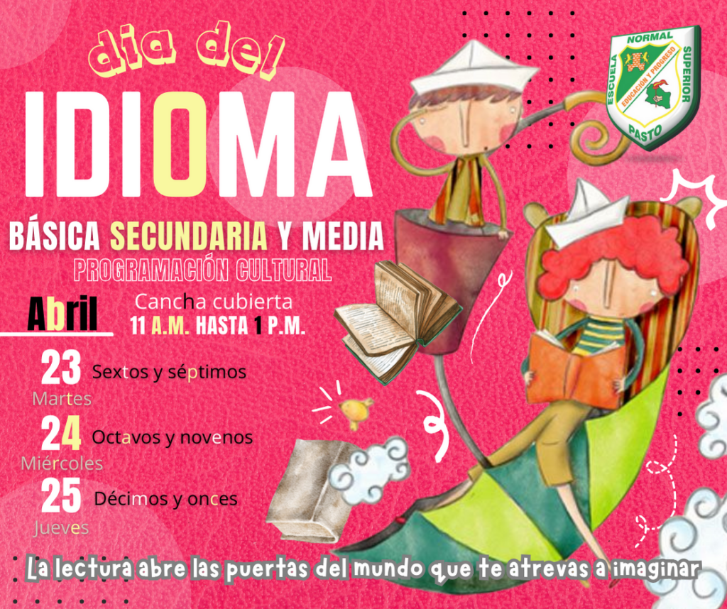 El área de Lengua castellana invita a toda la comunidad educativa de la Escuela Normal Superior de Pasto a participar de la celebración del Día del idioma 2024, un espacio donde se explorará los diferentes talentos de nuestros estudiantes como también recordar la importancia de la palabra en la formación de seres humanos integrales.