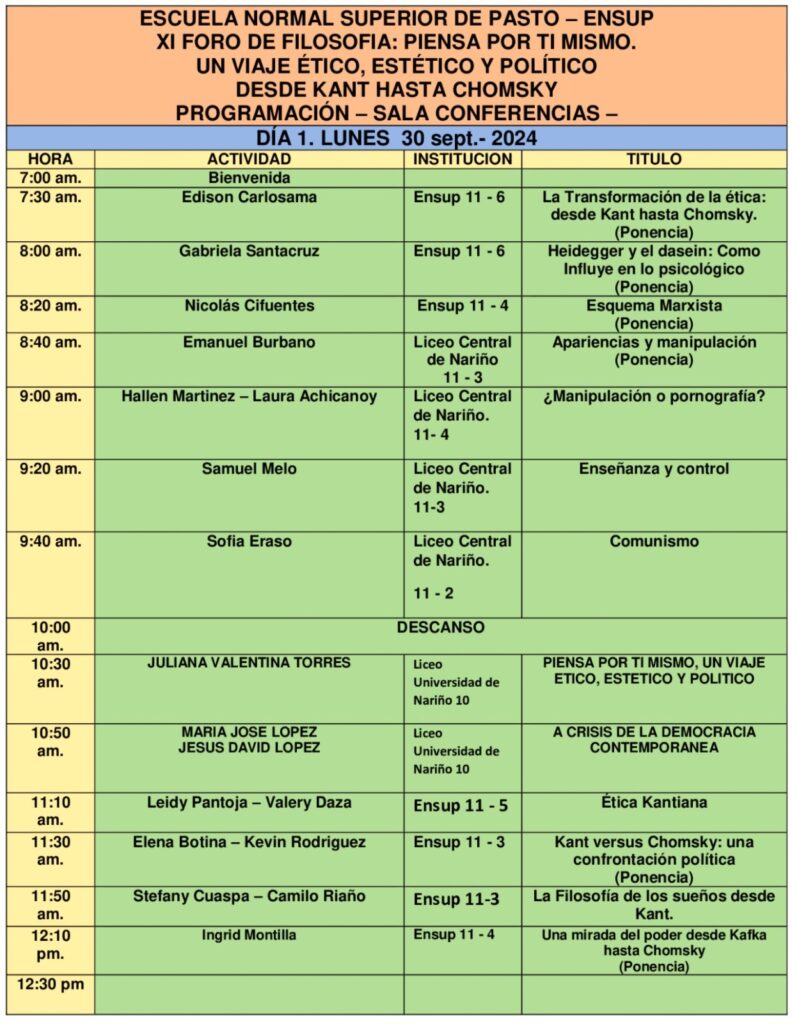 El segundo día, martes 1 de octubre, los estudiantes del grado once compartirán sus experiencias kantianas y chomskianas con los colegios invitados desde el debate, ponencias y conferencias.Sean todos bienvenidos.