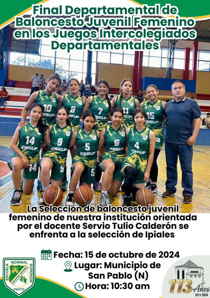 En Baloncesto femenino categoría juvenil, la selección de la Escuela Normal Superior de Pasto está jugando en San Pablo la Fase Final Departamental de los Juegos Intercolegiados Nacionales 2024.