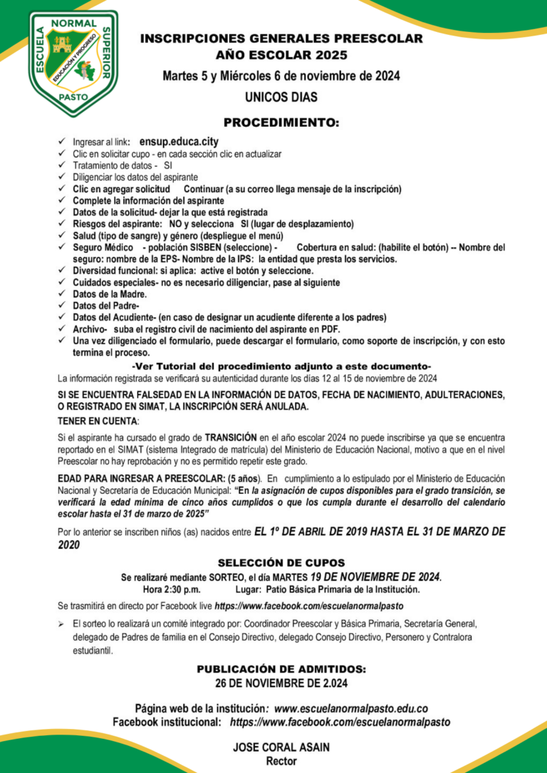 Cuarta fase. Publicación de admitidos. Día: 26 de noviembre. Medios: Carteleras de la Institución, pg. www.escuelanormalpasto.edu.co y Facebook: https://www.facebook.com/escuelanormalpasto