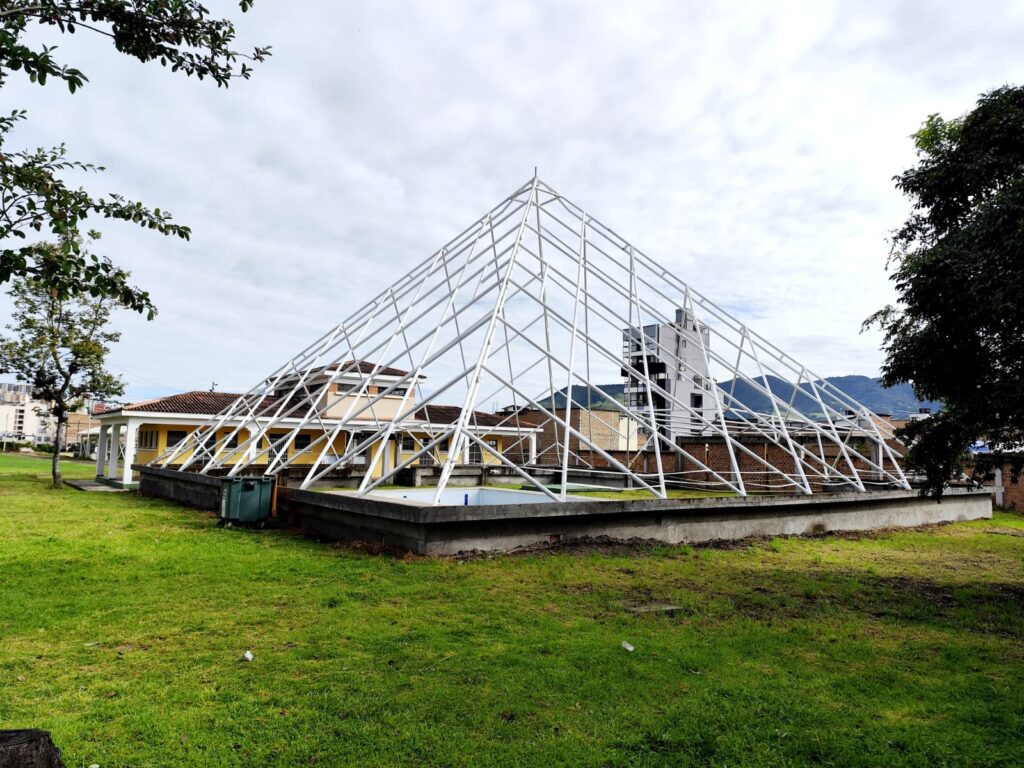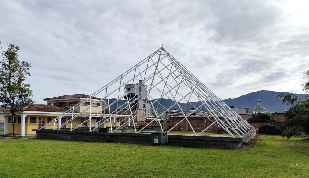 Luego de varias suspensiones, la obra incompleta la entregó el contratista en diciembre del año 2.023. Tiene un avance del 89 %. Falta la ubicación de varios tubos en la estructura de la pirámide y el policarbonato. Es importante mencionar que, en el proceso, las obras complementarias se recortaron, por ejemplo el sistema eléctrico, el piso en césped sintético alrededor de la piscina y accesos en adoquín.