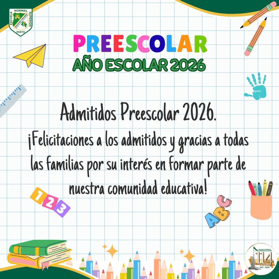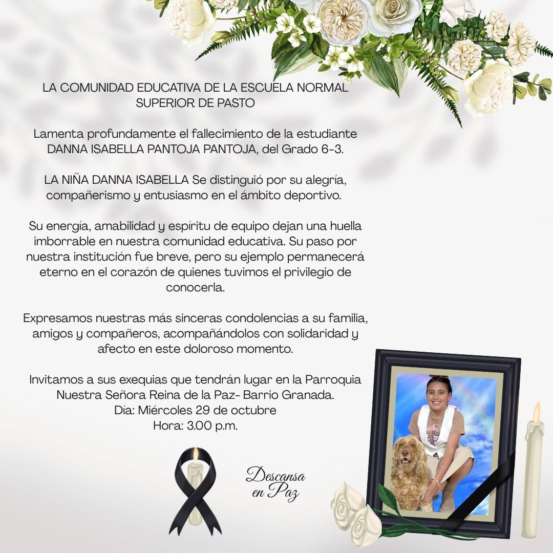 Noticias La Comunidad Educativa de la Escuela Normal Superior de Pasto lamenta profundamente el fallecimiento de la estudiante Danna Isabella Pantoja Pantoja, del grado 6-3. Leer más » 29 octubre, 2025
