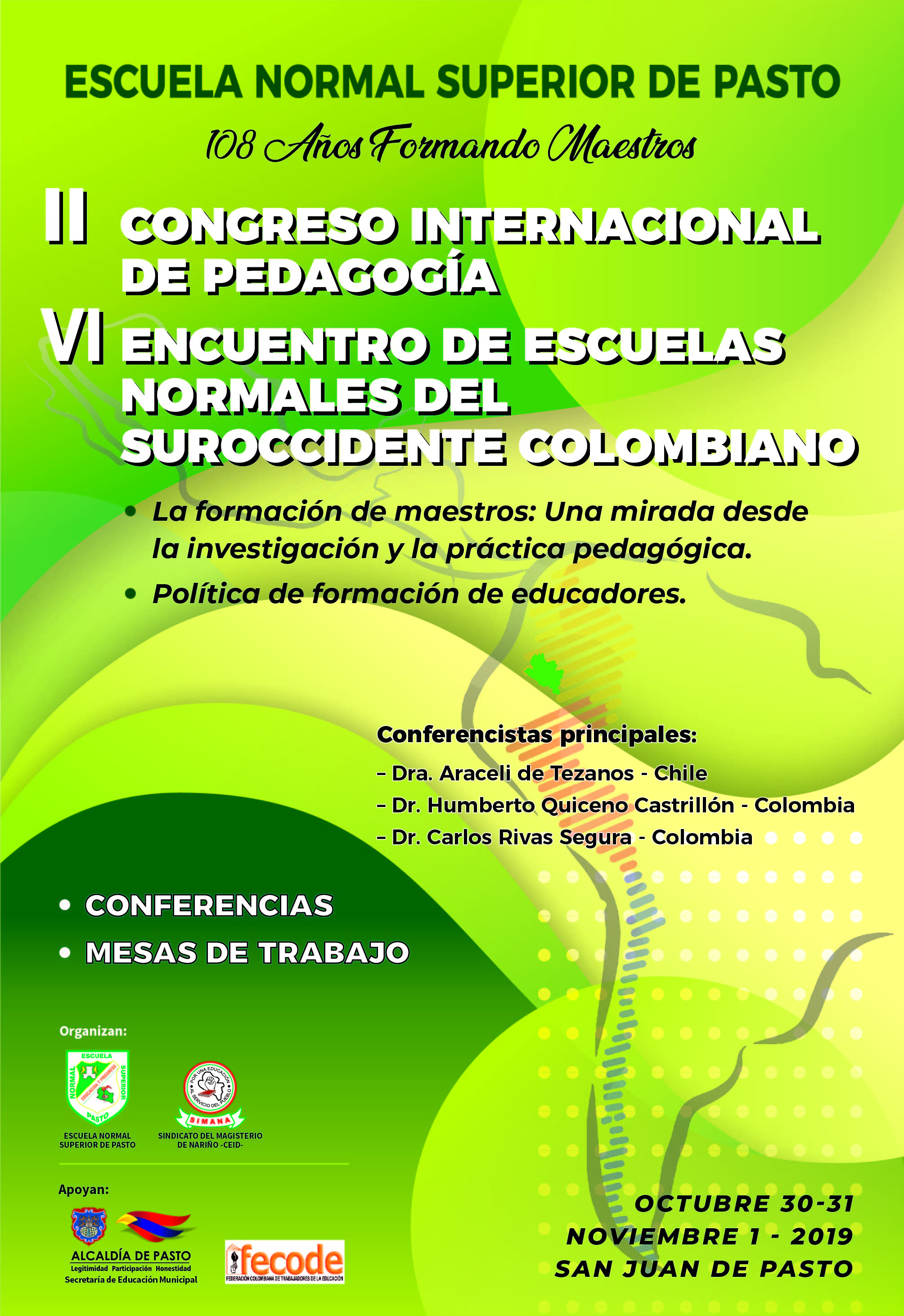 En noviembre del año 2.007, en la Escuela Normal Superior de Pasto celebramos el primer Encuentro de Escuelas Normales Superiores del Suroccidente colombiano, en este evento nos congregamos catorce ENS. El segundo encuentro se desarrolló en la ENS de Popayán- Cauca, el tercero en la ENS de Pitalito- Huila, el cuarto en la ENS Miguel de Cervantes Saavedra de Guacarí- Valle y el quinto en la ENS Santiago de Cali- Valle. Continuando con este proceso de formación docente en el contexto de la misión y visión de las Escuelas Normales, hemos organizado el SEXTO ENCUENTRO DE ESCUELAS NORMALES SUPERIORES DEL SUR OCCIDENTE COLOMBIANO y el II CONGRESO INTERNACIONAL DE PADAGOGIA, evento a realizarse en nuestra Institución los días 30, 31 de octubre y 1 de noviembre del presente año. Los temas centrales a tratar son: Investigación y Práctica Pedagógica y Política de Formación de Educadores.